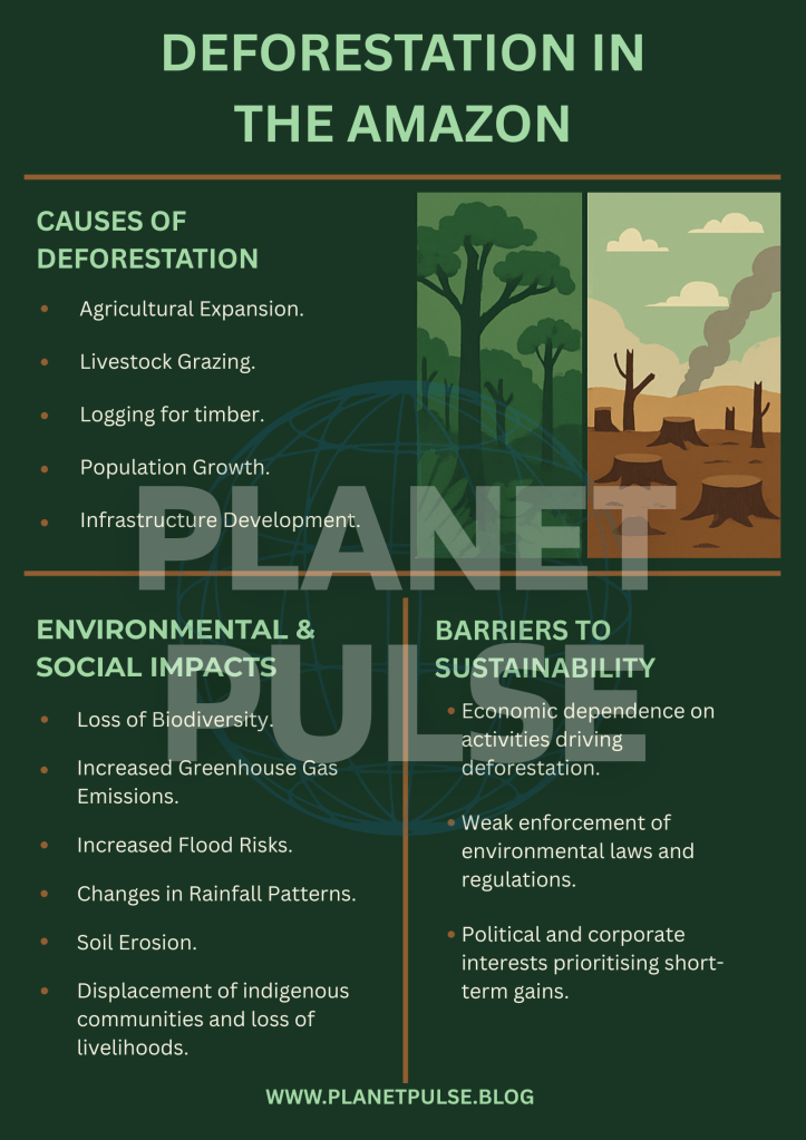 Deforestation in the Amazon also disrupts rainfall patterns. Reduced transpiration from the rainforest contributes to decreased rainfall during the dry season, further compromising the forest’s resilience (Zemp et al., 2017). These changes affect not only local ecosystems but also have global consequences.