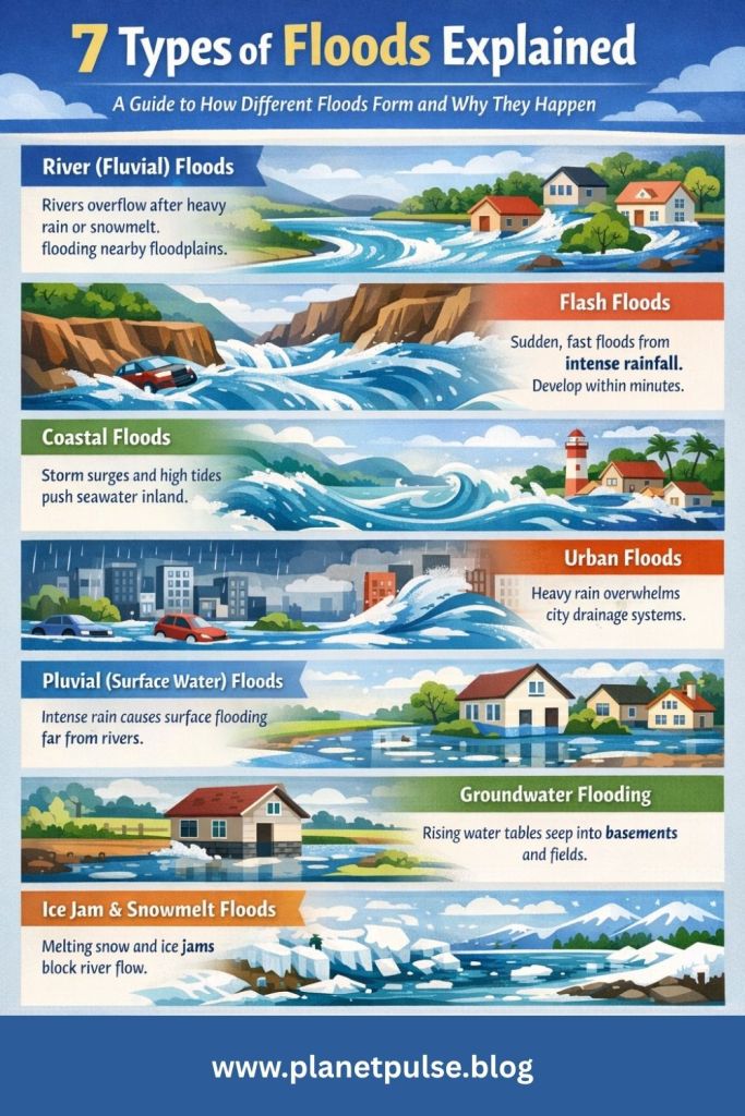 1. River (Fluvial) Floods: These occur when rivers overflow their banks due to prolonged rainfall, snowmelt or upstream land‑use changes. They often affect large areas and can last for days or weeks.